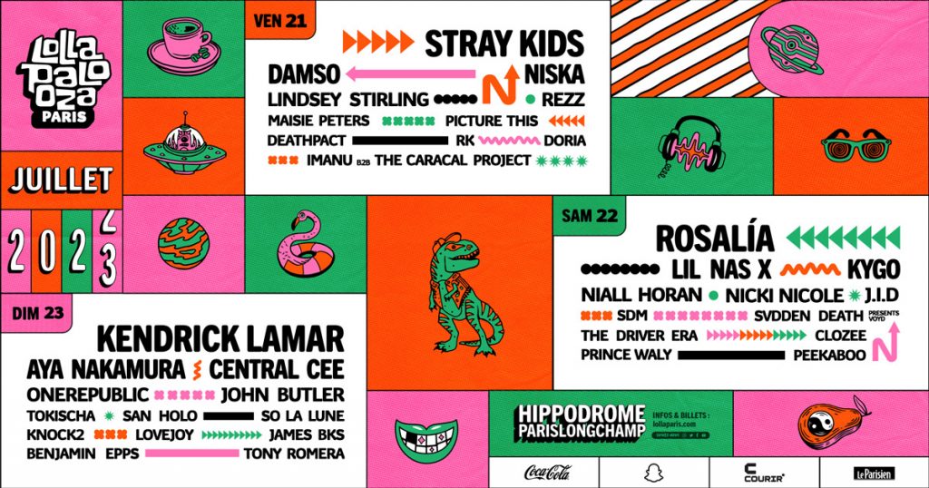 L’édition 2023 de Lollapalooza pioche dans plusieurs genres pour proposer une programmation variée à ses festivaliers. Que vous aimiez le rock, le rap, l’électro ou encore le hip hop, vous trouverez chaussure à votre pied ! Pendant 3 jours, une soixantaine d’artistes se relaieront à l’Hippodrome de Longchamp pour le plus grand plaisir de la foule. Et l’ambiance sera très certainement au rendez-vous dès le premier jour avec Damso, Stray Kids ou encore Niska. Vous pourrez aussi retrouver entre autres Dean Lewis et ses ballades pop, le rappeur Makala et l’électro énigmatique de Deathpact.